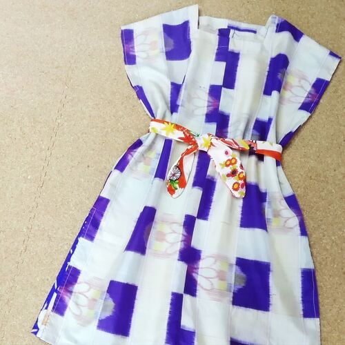途中までほどいた状態でもらい受けた銘仙の着物を 最後までほどいて洗ってからワンピースにリメイクしました 直線裁ちというか貫頭衣みたいww 見返しの型紙だけ作ってあとは直接布に線を引きました。 マチは作らないでストンとした形にしてもよいのですが 別…